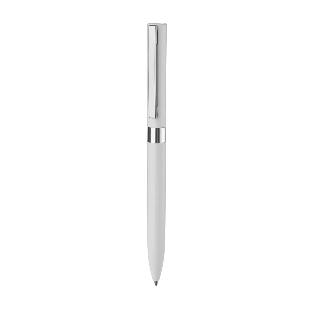 Caneta esferográfica em alumínio com escrita em azul, acabamento com pintura metálica laqueada.